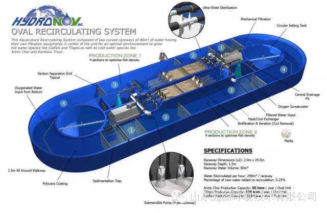 拆分回路:氨硝化为亚硝酸盐并随后为硝酸盐的过程,增大通过生物过滤器的流量会对硝化速率和系统性能的稳定性产生不利影响。为了降低了投资和运营成本,使用拆分回路这种设计使这过程被分隔开来。通过独立地系统调整使鱼的要求始终得到满足。确保系统中所有的组件得以完全利用,由于根据广泛经验和周密的计算,通常只将30%的水量导入到生物过滤器里,可确保正确的滞留及细菌接触时间,从而保证高效的硝化作用和更有效的控制病原体。采用拆分回路设计,可使生物过滤器的尺寸不常规需要增缩小三倍,以获得同样的效果。