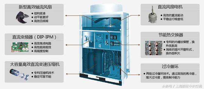 室外机压缩机及风扇电机全部采用直流电机,电机效率提升30%以上,节能性更好。