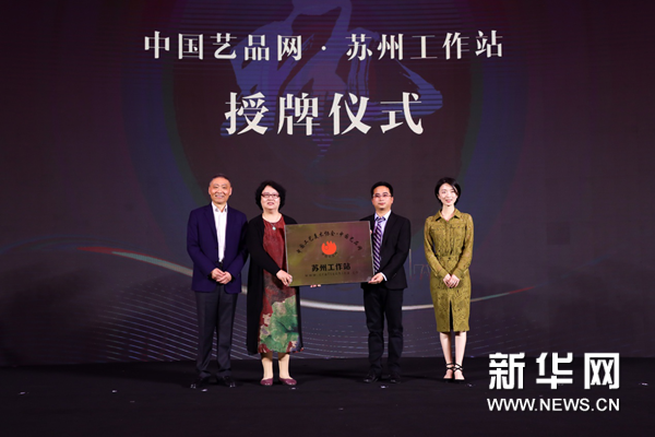 中国工艺美术协会副会长马达,中国工艺美术协会·中国艺品网、中艺互联商务科技(北京)股份有限公司副总经理陈娟为“中国艺品网·苏州工作站”授牌。