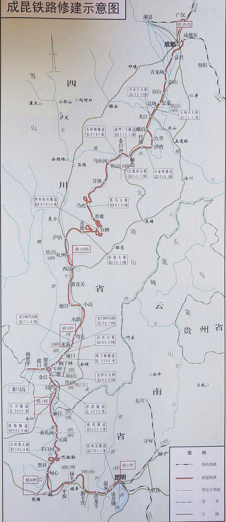 在成昆线的修建大军中,以铁道兵第一、五、七、八、十师、铁二师的8团、独立机械团、独立汽车团和铁道部第二工程局(前身为西南铁路工程局)为主力,并有铁道部第四工程局、大桥工程局、电务工程总队和成都、昆明铁路局等单位职工以及沿线民工参加。修建大军在成都至西昌的北段、西昌至昆明的南段全面铺开施工,高峰时有30多万人在这片崇山峻岭间逢山开路、遇水架桥。