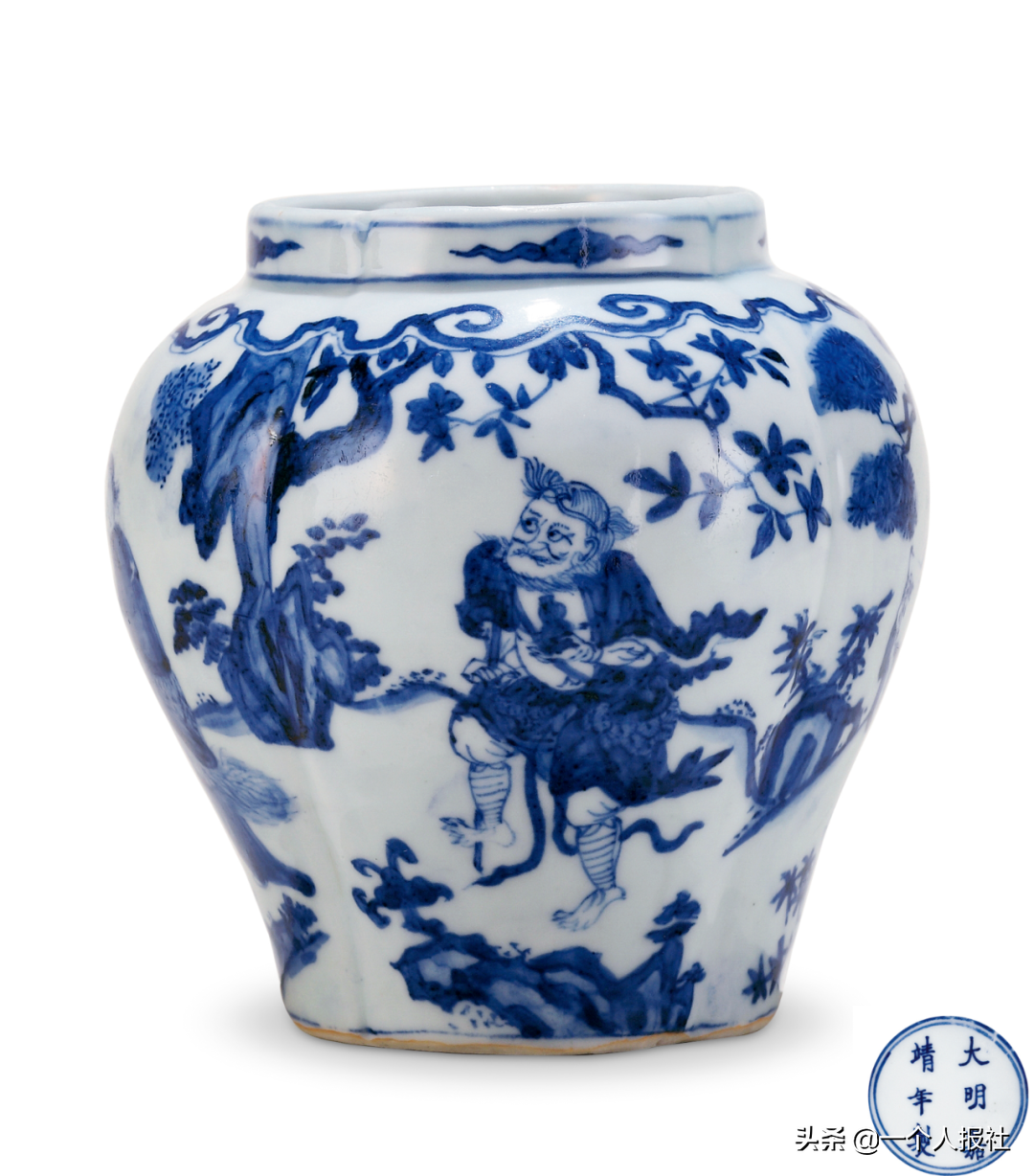 本品正是一份反映嘉靖皇帝此番信仰之例证,其主题纹饰独特,通景绘饰“蓬头四仙”图。画中所绘铁拐、刘海、寒山、拾得四仙,秃顶披发,因皆不施巾帻,谓之“四蓬头”,为元明时期民间喜闻乐见的艺术题材,正是源于嘉靖皇帝对道家的推崇,“蓬头四仙”题材才得以首次出现在明代官窑瓷器之上。本品所绘四仙布置错落,姿态各殊,形骨古野,怪戾骇俗:铁拐李侧首仰视,双目有神,一手扶持拐杖,一手托着葫芦宝物;寒山笑容盈盈,双手执卷而立;刘海手舞足蹈,嬉戏金蟾;拾得手携扫把,欢喜前行。纵观全图,放笔纵墨,轻盈飘逸,诸仙情势具佳,形象诡怪,得妙趣于天然,一如明初名家商喜之作《四仙拱寿图》,运笔刚劲有力,气势挺健,饱满而富有弹性,自见飘逸之气。对四仙的嘴、眉、颧骨均加以强调,使形象更具冲击力和生命力,尤其对嘴部的夸张表达,突出了“笑”态,增强了画面的喜庆气氛,予人观之,忍俊不禁,深受感染。