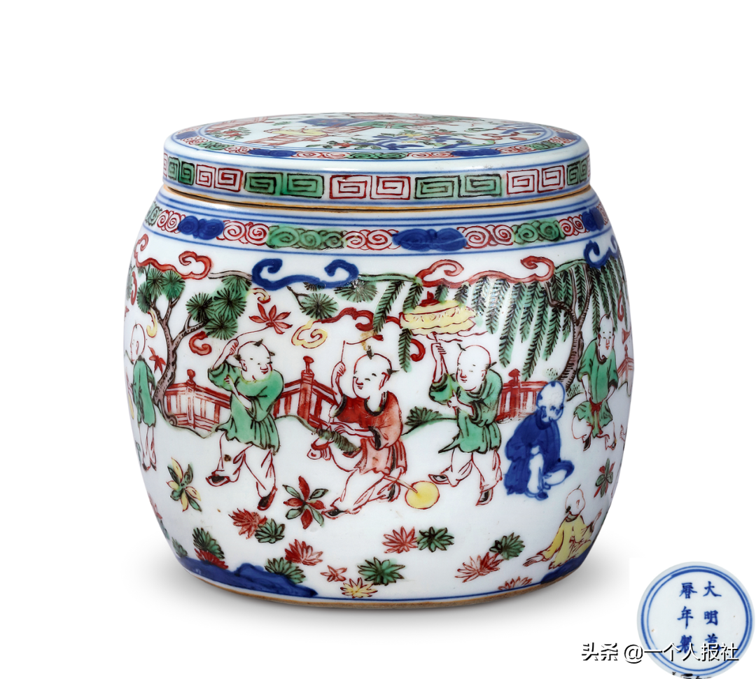 明成化青花海水江崖矾红彩龙凤纹盖罐