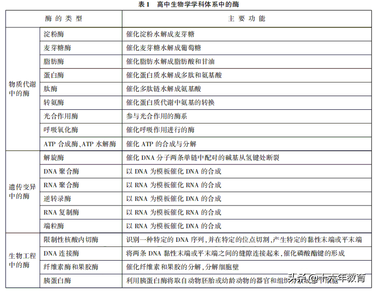 酶是由活细胞合成、在机体内行使催化功能的生物催化剂。目前已发现的酶约有万余种,在高中生物学学科体系中常见的酶及功能概括如表1所示。