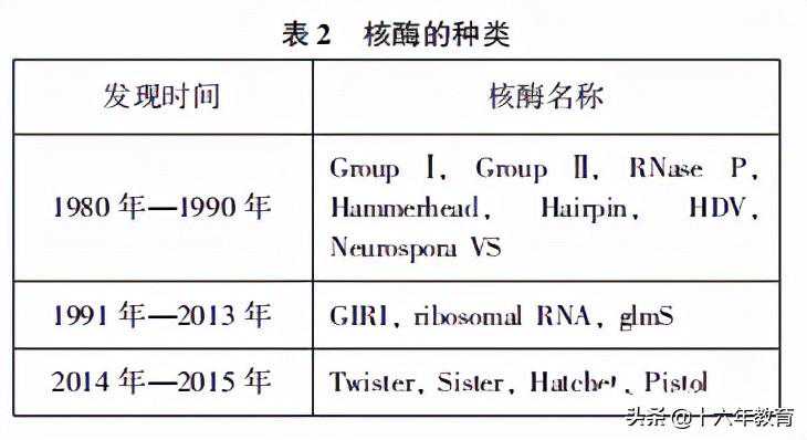 核酶是具有催化功能的RNA分子,大多数核酶具有剪切RNA的功能。经过30多年的研究历程,科学家已证实自然发生的14种核酶(表2)。在高中生物学学科体系中涉及的核酶主要有催化真核细胞核mRNA前体剪接的剪接体和催化蛋白质生物合成的核糖体。
