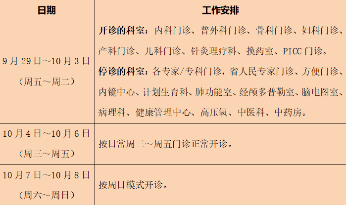 9月30日、10月2日、3日、4日、6日全天开诊;10月5日上午开诊,其他时间停诊。
