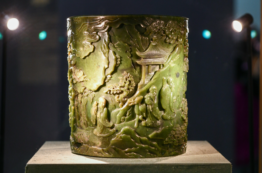 明清以后,市民商业阶层形成并发展起来,玉器在民间逐渐流行开来,并常用于文房用具。展览中的一件清代“三星”笔筒,外壁采用高浮雕技法多层雕刻,主体纹饰为“福、禄、寿”三星,辅之以童子、山石、松树、亭台、石桥、祥云、溪水和瀑布等景物。雕刻技法高超,人物、动物生动形象,显示出清代高超的琢玉工艺。