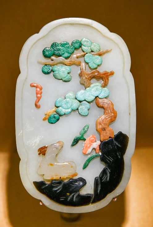 辽宋以来,巧作工艺开始流行。明清以后,金属镶玉、描金和硬木嵌玉工艺从宫廷发展到了民间。展览中的一件明代的铜嵌玉松鹿带銙,就展现了不用上色即是“画”的意匠巧作。这件玉雕雕刻了百花丛中的两只梅花鹿,巧妙的是,两只梅花鹿分别呈现出红色和白色的样子。这是玉工雕琢时利用玉石的天然沁色,使不同的颜色和图案巧妙结合,从而产生别致的艺术效果。