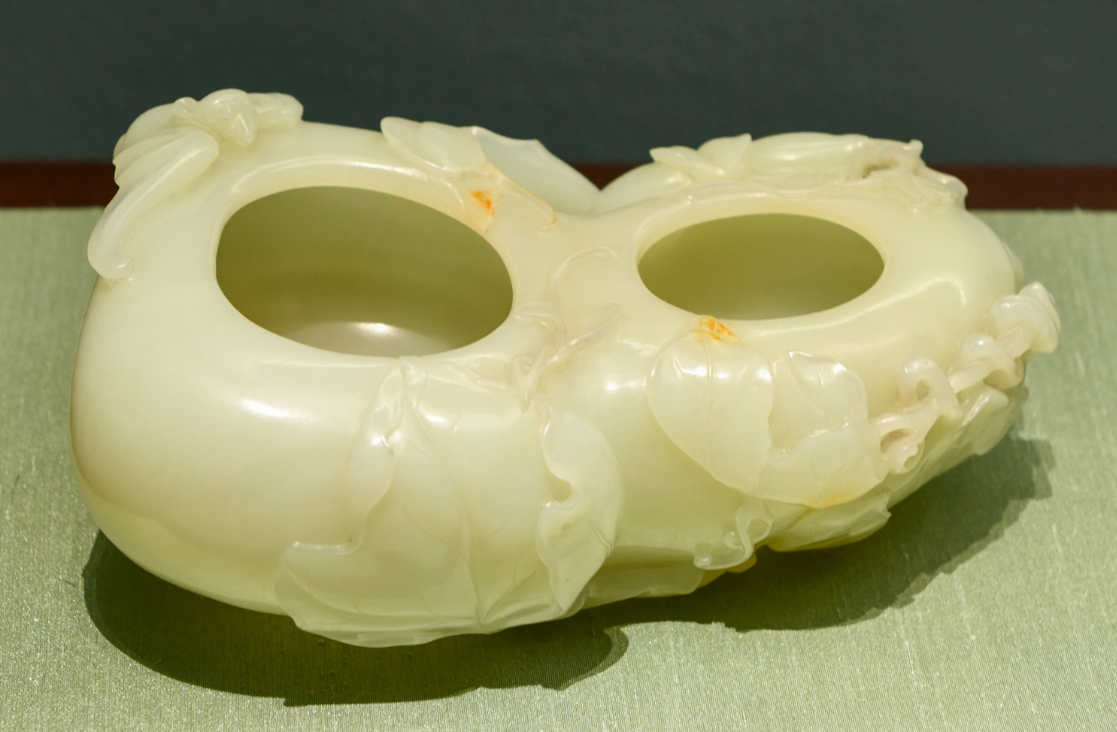 还有一件葫芦形水丞,是置于书案上的贮水器,外壁透雕、高浮雕葫芦枝蔓纹和蝙蝠纹。葫芦因果实众多、枝蔓缠绕绵长,寓意子孙昌盛,世代兴旺。