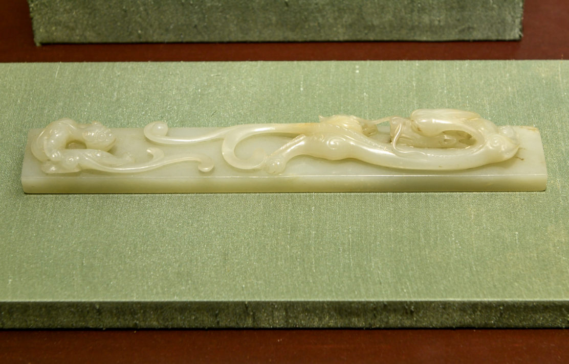古代文人还时常会把小型的青铜器、玉器放在案头上把玩欣赏,因为它们都有一定分量,所以人们在玩赏的同时,也会顺手用来压纸或者是压书,久而久之,玉器也发展成为一种文房用具——镇纸。
