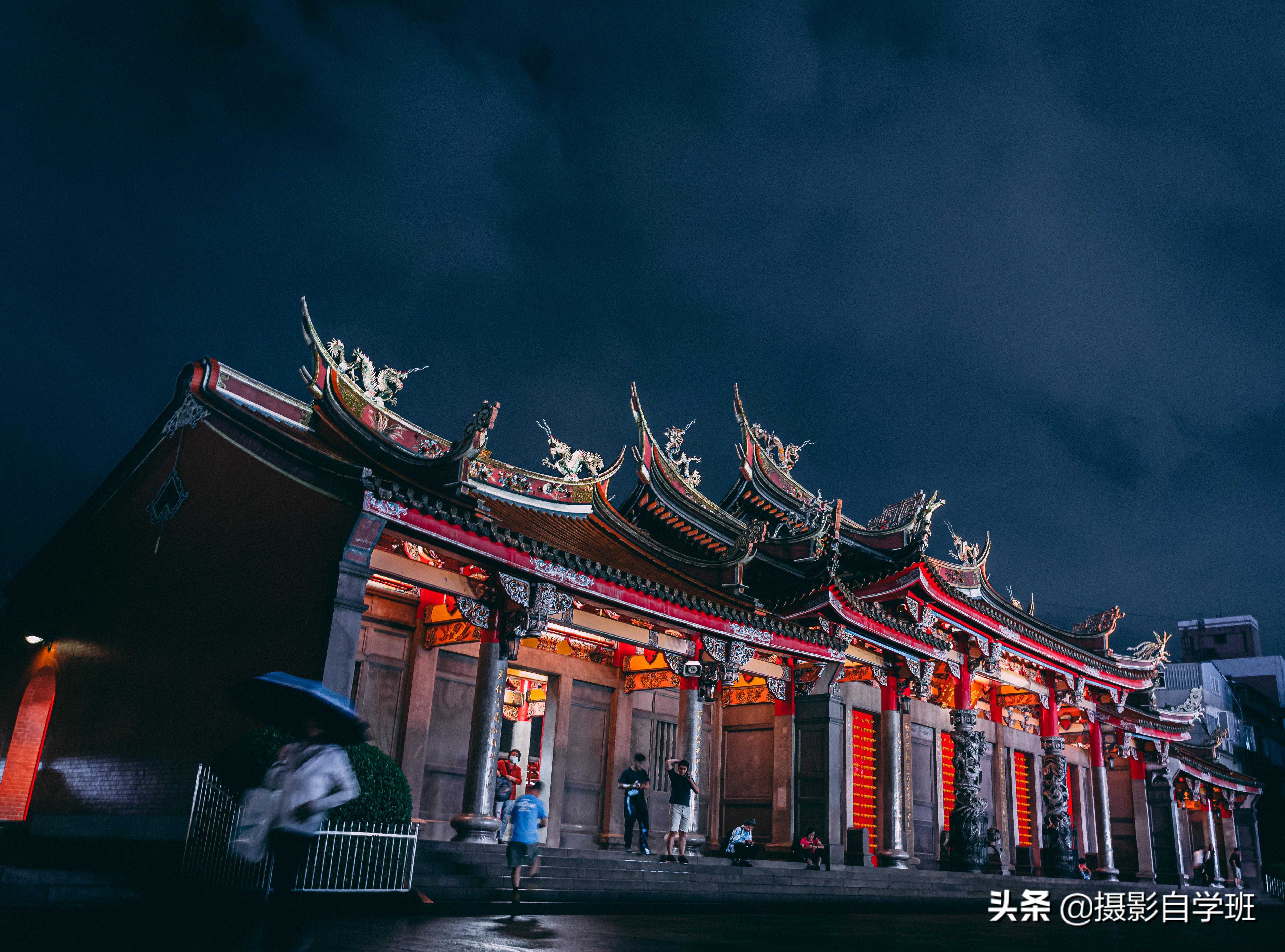 (1)当建筑暗时,我们要等待古建筑上的灯亮起来,有了光,古建筑才会有亮,剩下就是怎么拍的问题了。