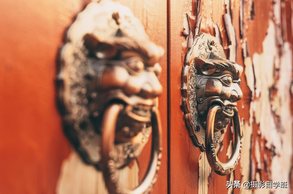 很多古建筑前都会有石狮子,我们用石狮子作为清晰的前景,同时使用小光圈把背景的古建筑也拍得清晰,照片的纵深感,层次感,立体感都会很好。这种角度也比单独正对着门面拍更震撼。