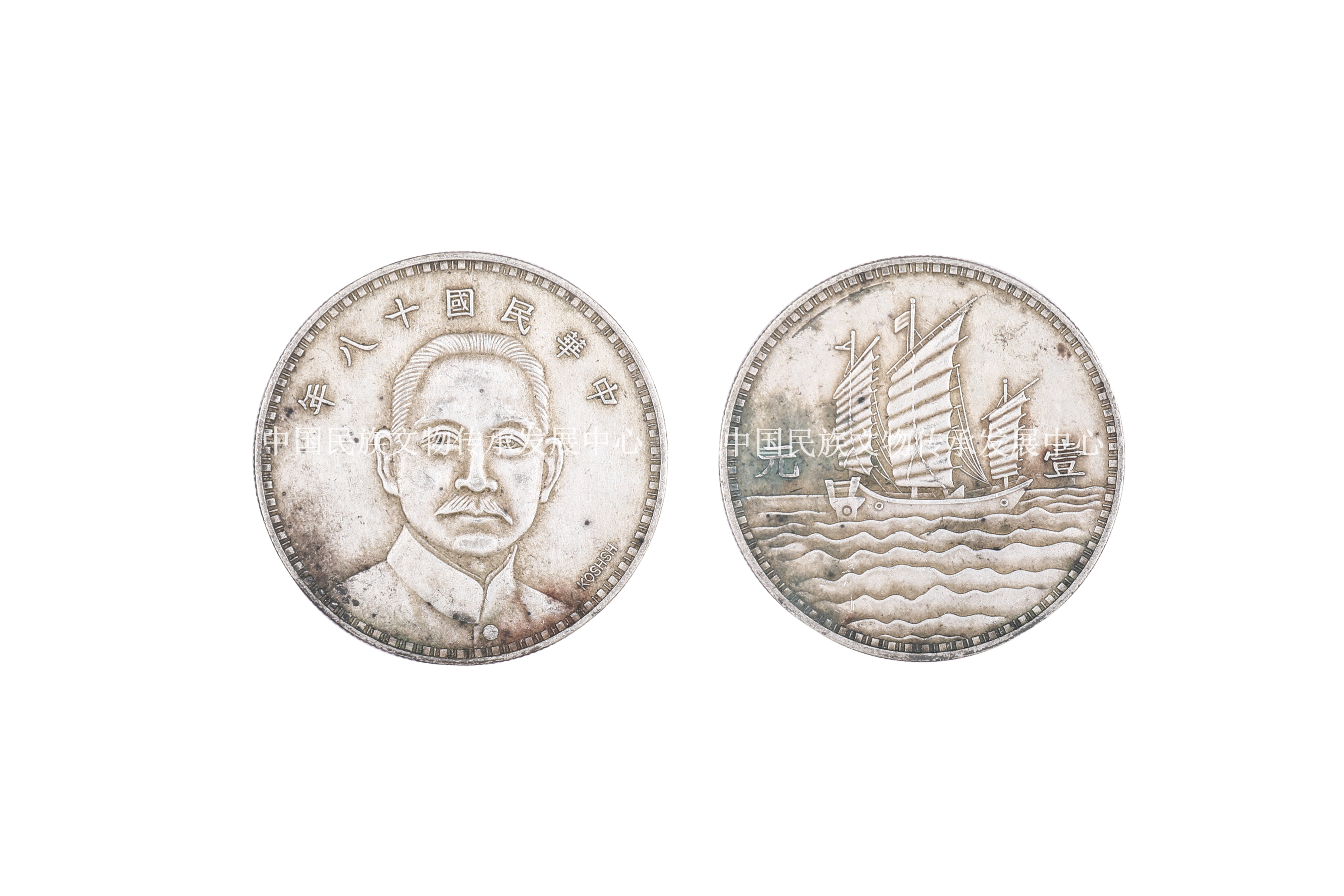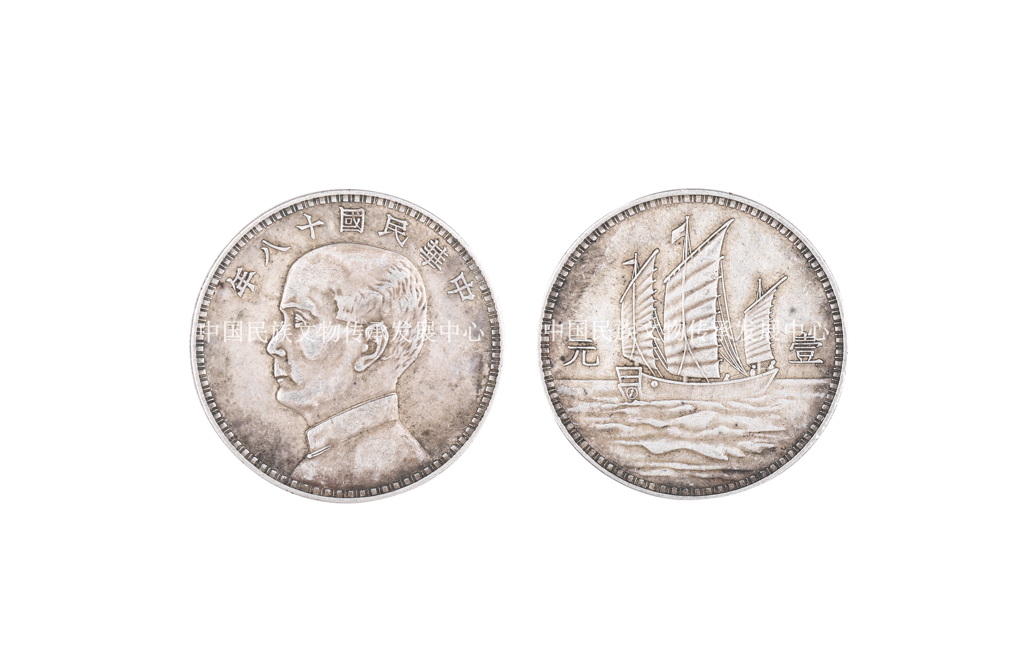 1929年(民国十八年),国民政府委托美国、意大利、英国、日本、奥地利等五国雕刻钢模,试铸孙中山像壹圆银币,正面图案为孙中山先生西装正面像,孙氏头像上环刻铸造年份“中华民国十八年”字样,背面图案为三桅帆船驶于海上,帆船左、右刻面值“壹元”,这组样币因背面帆船上有三根桅杆,钱币收藏界俗称它们为“三帆船”币。