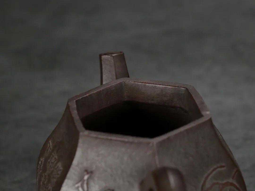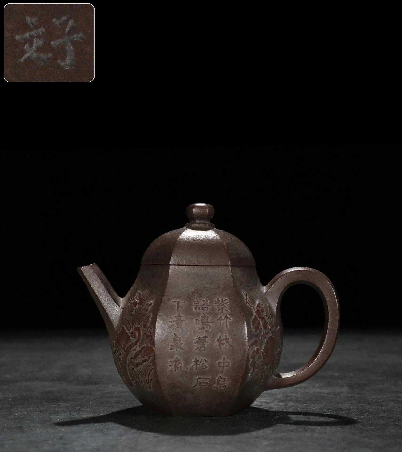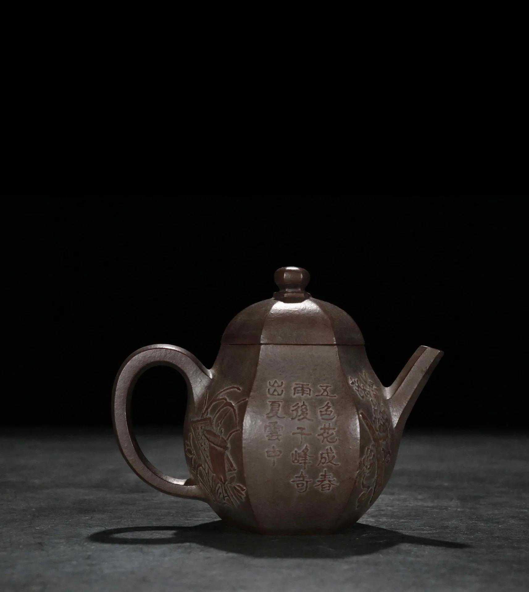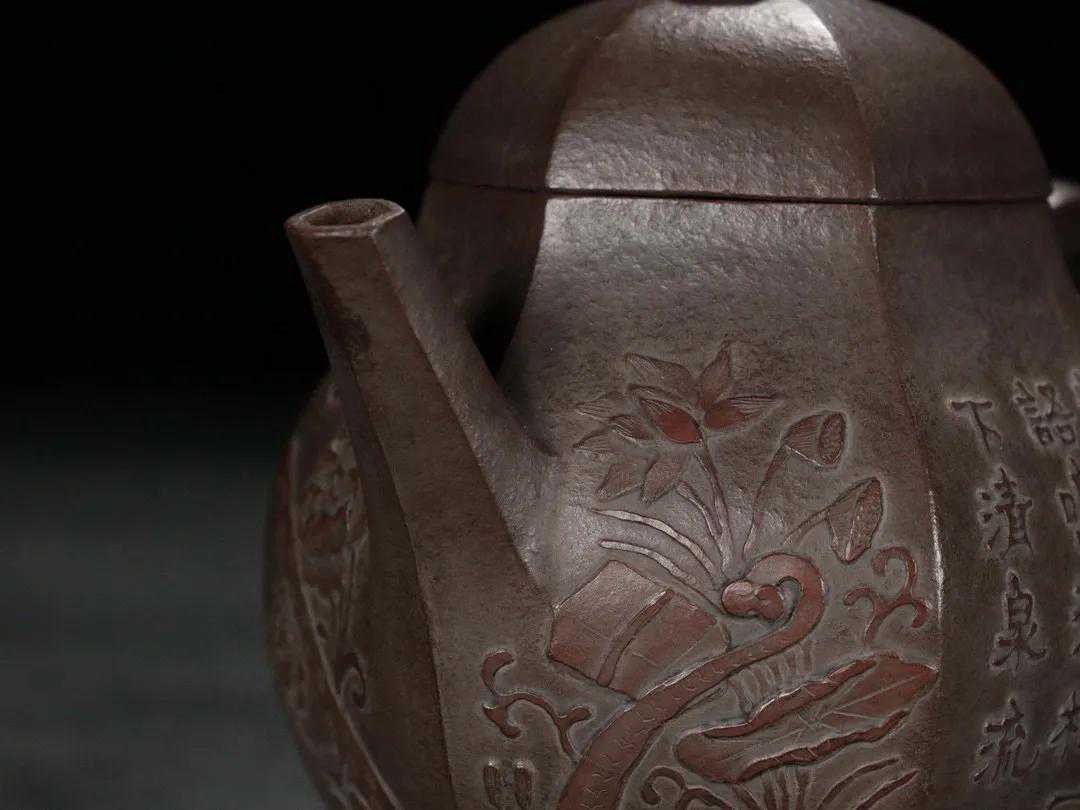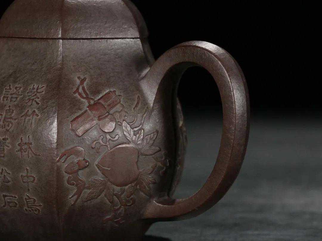 【简述】该壶为六方造型,壶身泥绘刻工,整壶用料讲究,紫砂颗粒饱满明显,壶身刻绘细致如画,造型秀气沉稳,色泽古雅,足见功力!做工细致,趣味美壶,泥质醇厚,色泽温和,触手生温,难得的佳作。