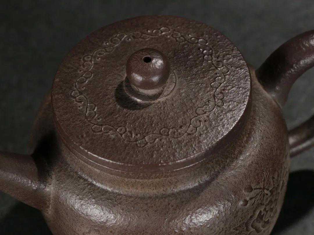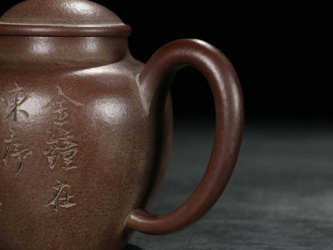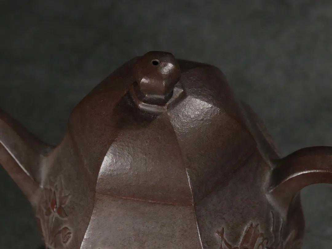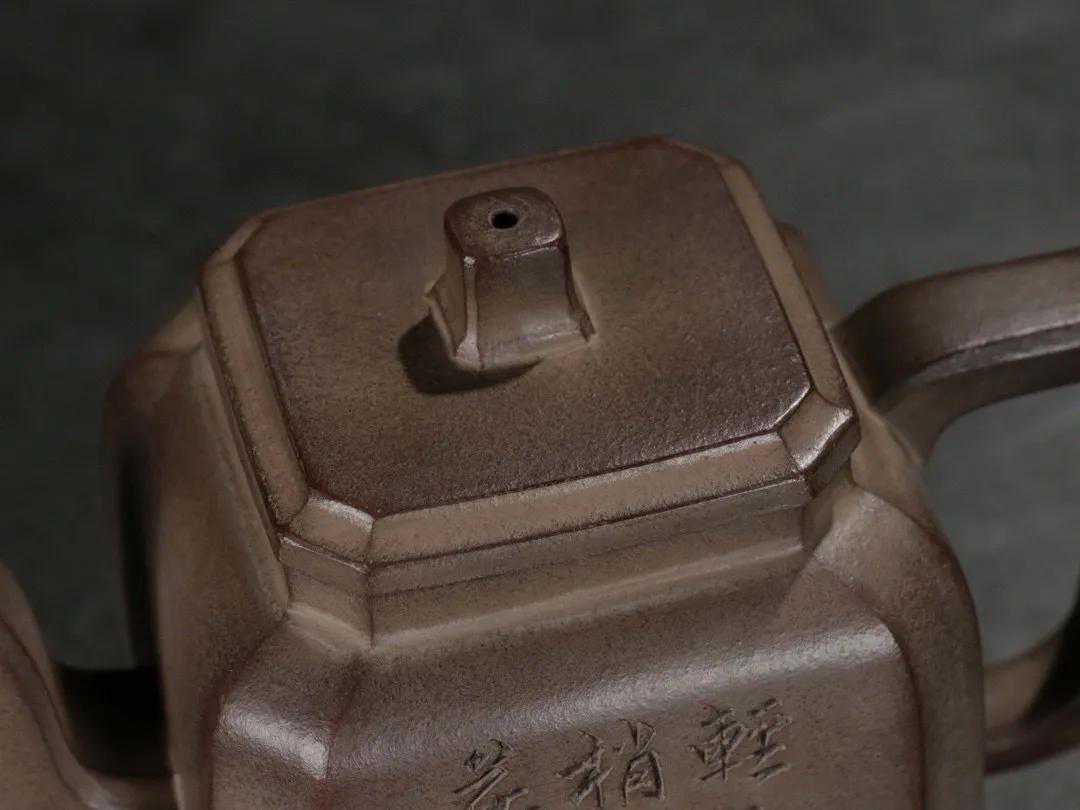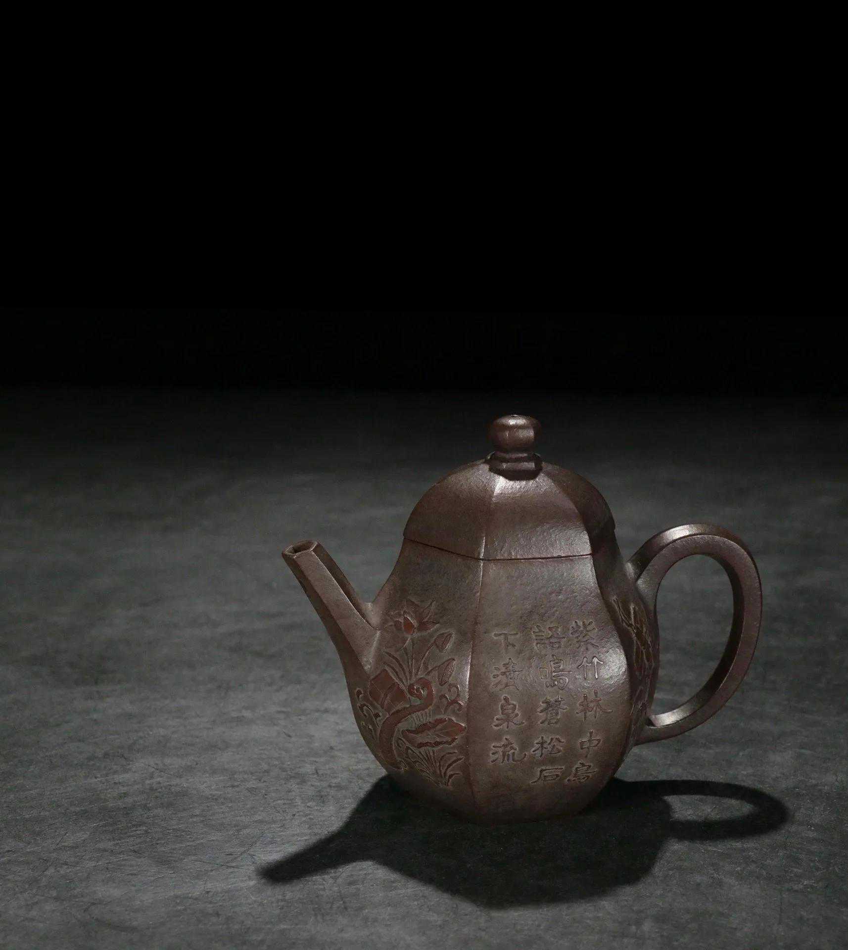 【简述】该壶为六方造型,壶身泥绘刻工,整壶用料讲究,紫砂颗粒饱满明显,壶身刻绘细致如画,造型秀气沉稳,色泽古雅,足见功力!做工细致,趣味美壶,泥质醇厚,色泽温和,触手生温,难得的佳作。