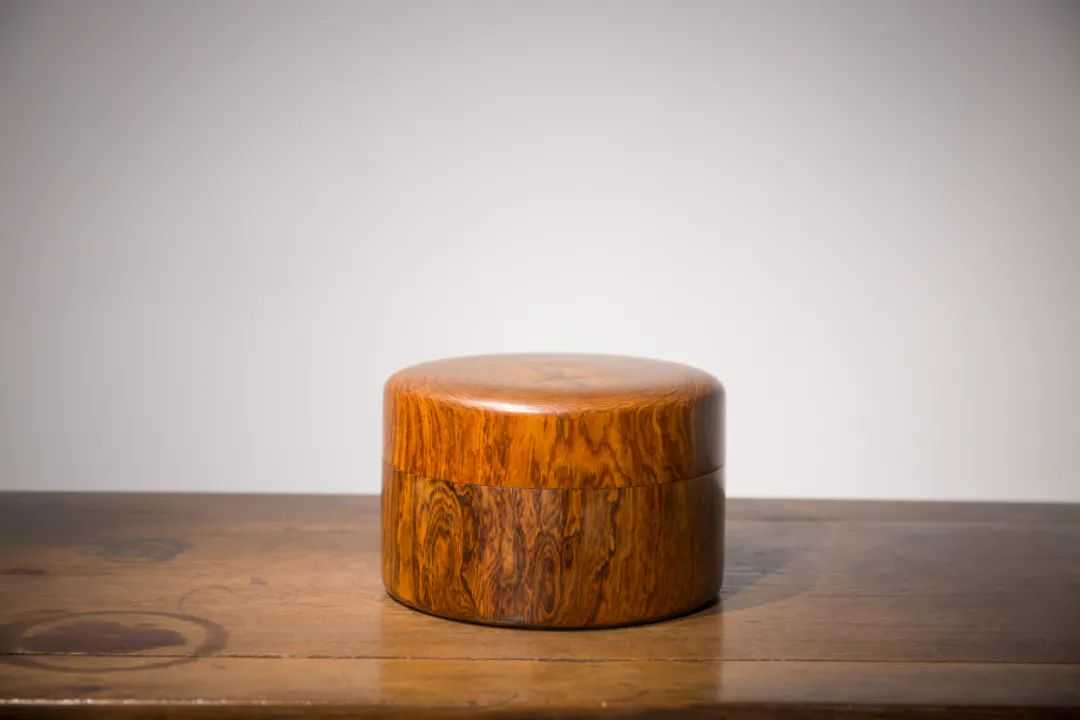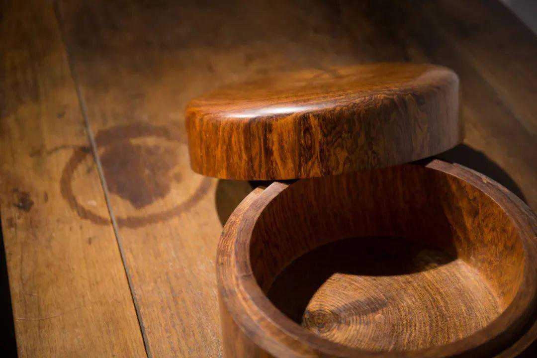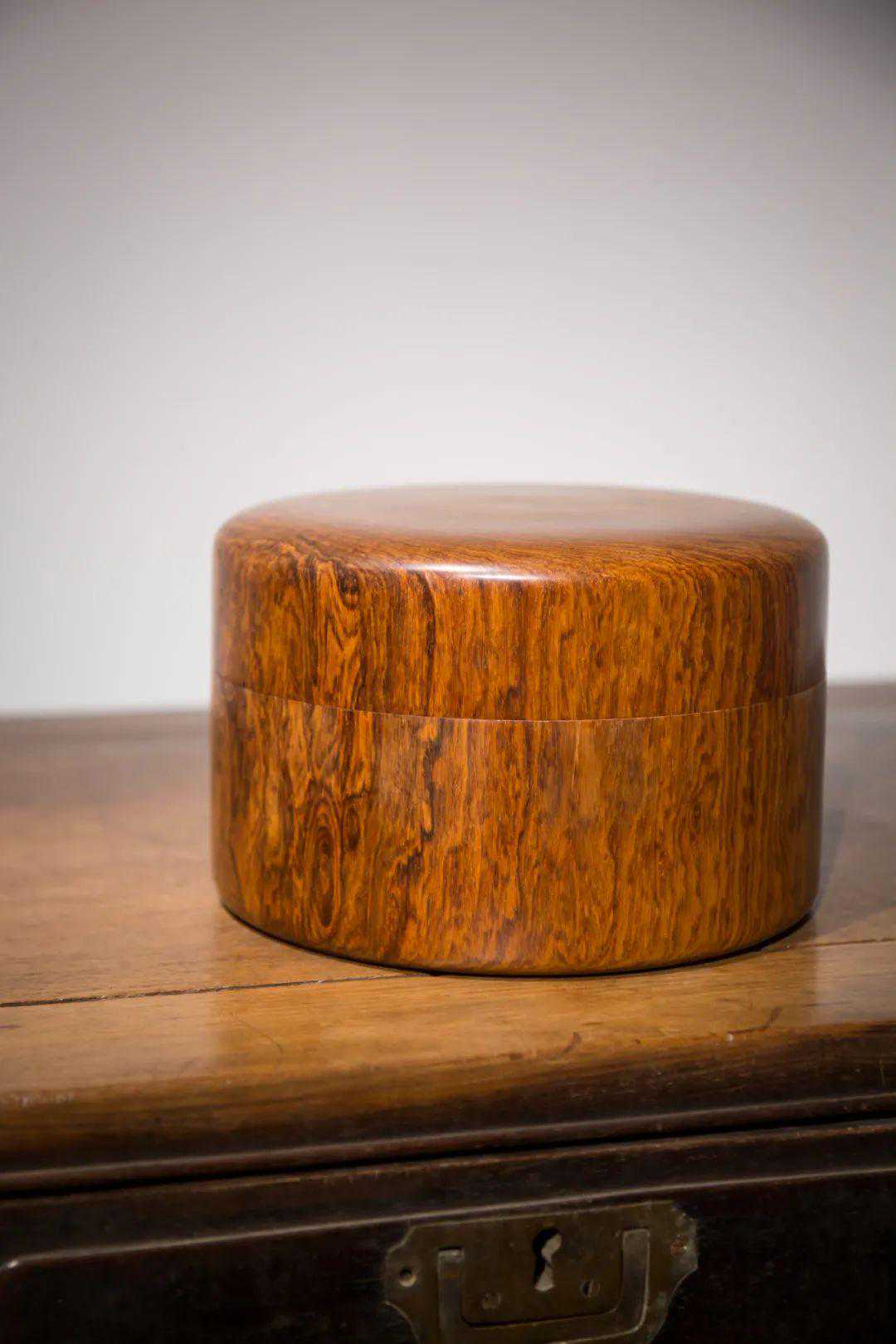 而以如此大直径的黄花梨木料,取其心材,整块旋出做盖盒,耗料费料之多可见一斑,如此之器更是少见;其选材的珍贵与用料的厚实,均有大可称道之处。