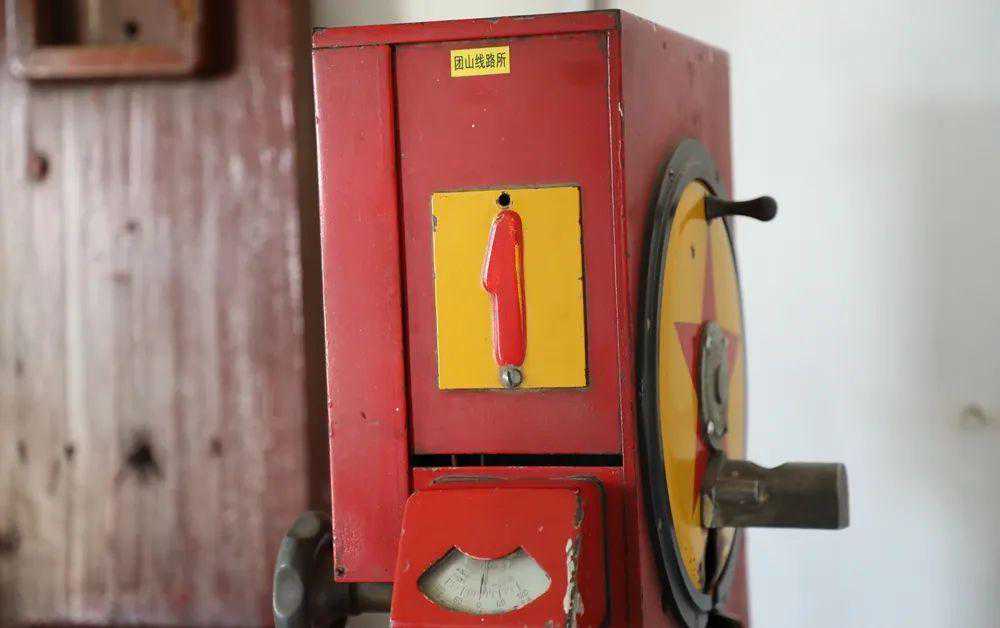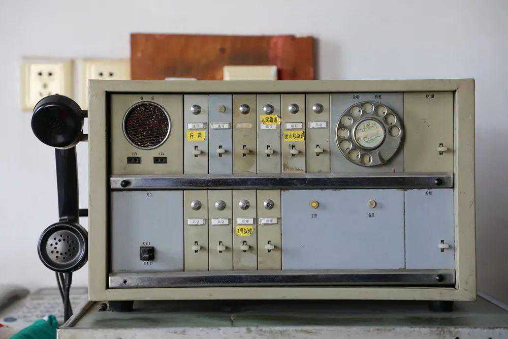 机体上有明显的历史印记主体鲜红色的控制台上左右分列立式座机分别代表上下行区间占用