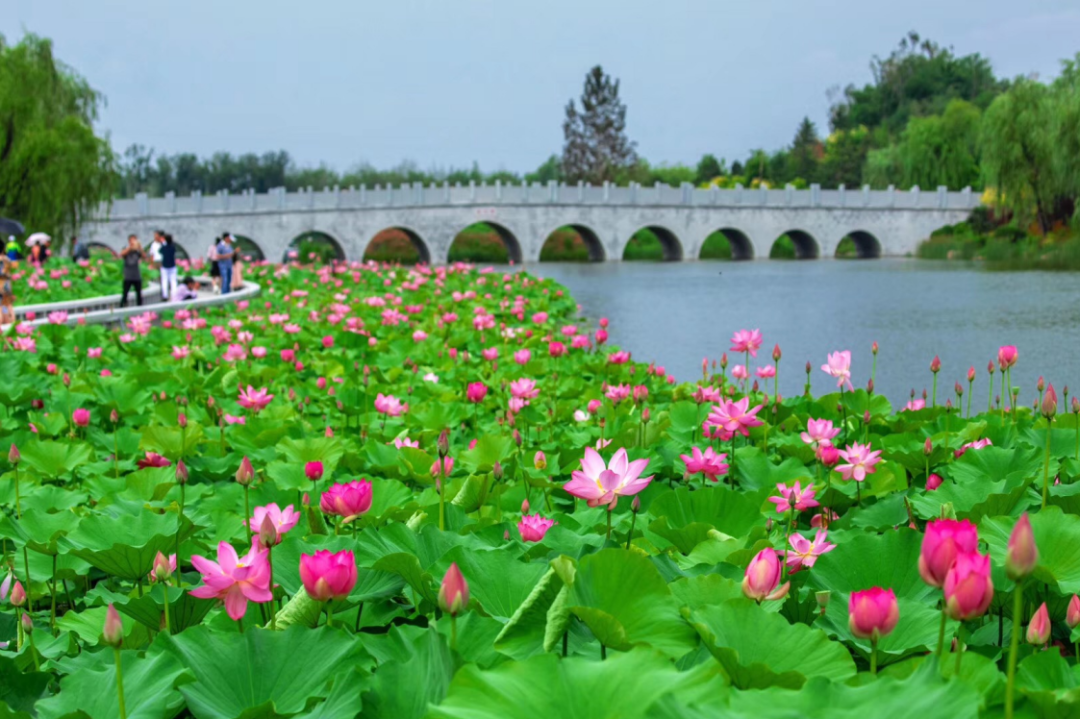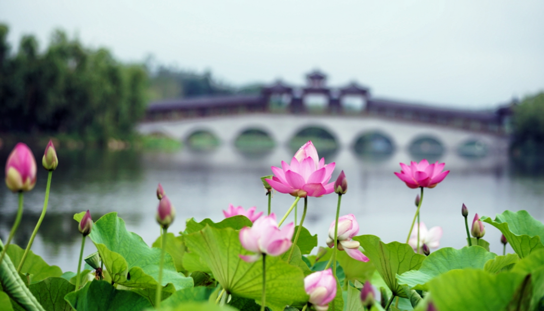 当荷花盛开时,仿古的廊桥与朵朵粉红的荷花互相映衬。波光粼粼,流水潺潺,带动荷叶、荷花也摇曳起舞,让人沉醉在这如诗如画的场景中,连空气中似乎都能闻到淡淡的荷香。