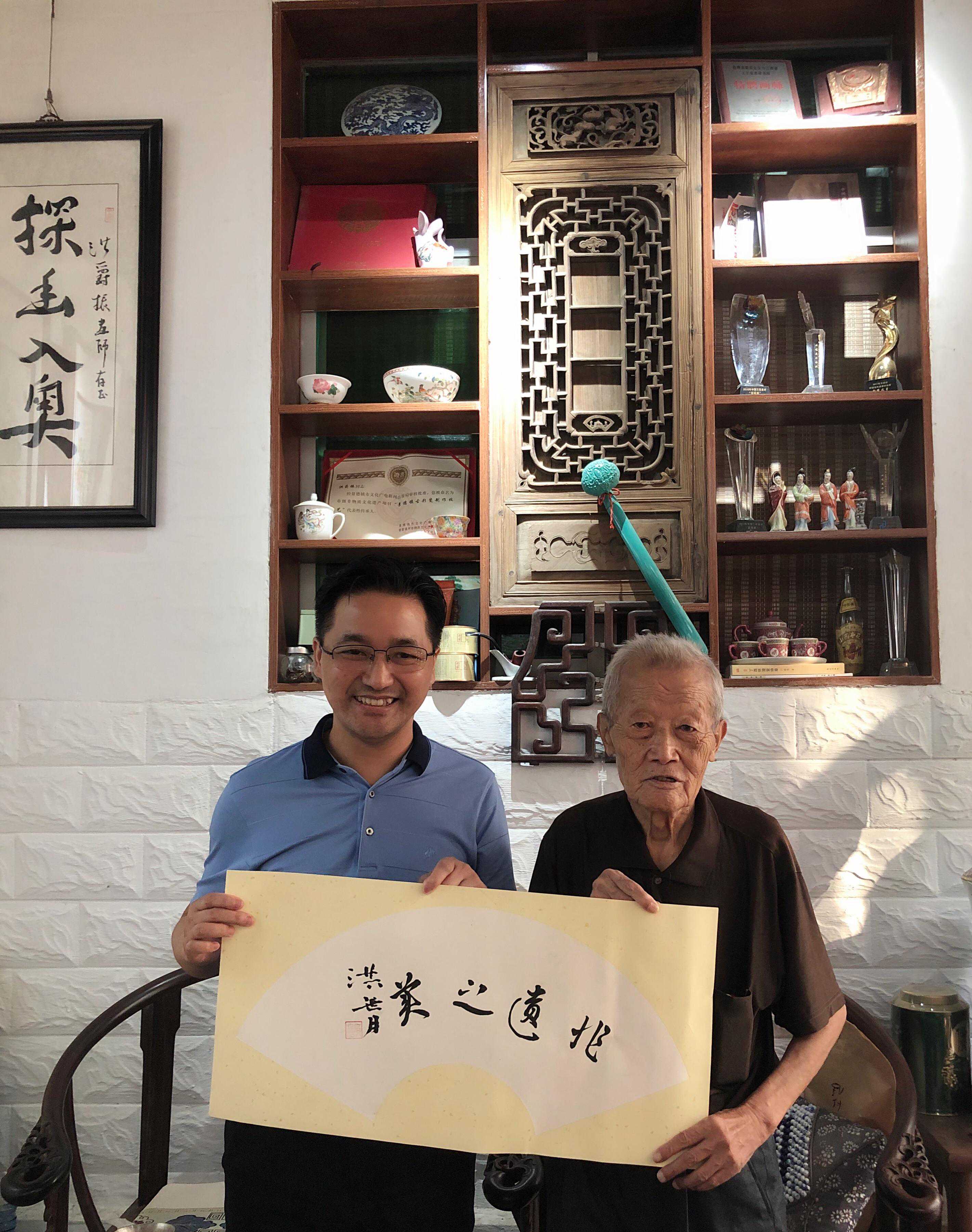 古彩瓷大师洪世月(右一)为《非遗之美》总编姚泽民(左一)题词“非遗之美”