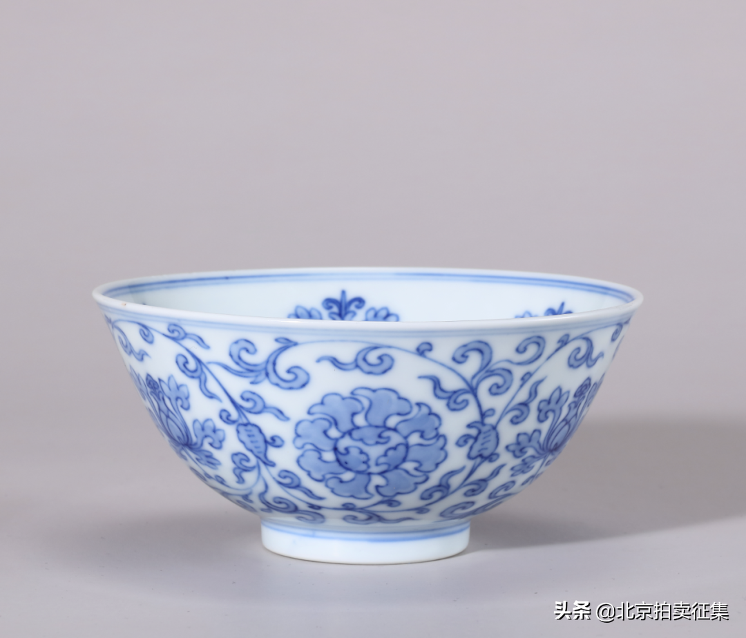 明万历仿宣窑青花外莲瓣纹内缠枝花卉纹碗
