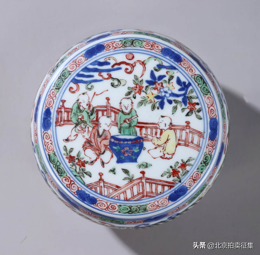 明万历五彩柳荫莺蝶图盖盒