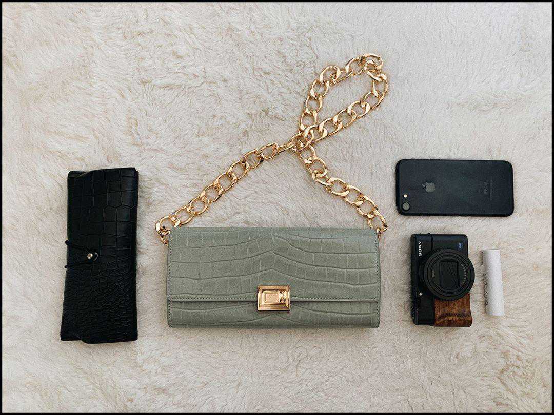 鳄鱼纹牛皮材质的信封款,皮子质感蛮棒的,雾霾绿贼拉气质,背上恍惚以为自己成了高贵的富婆(不是)