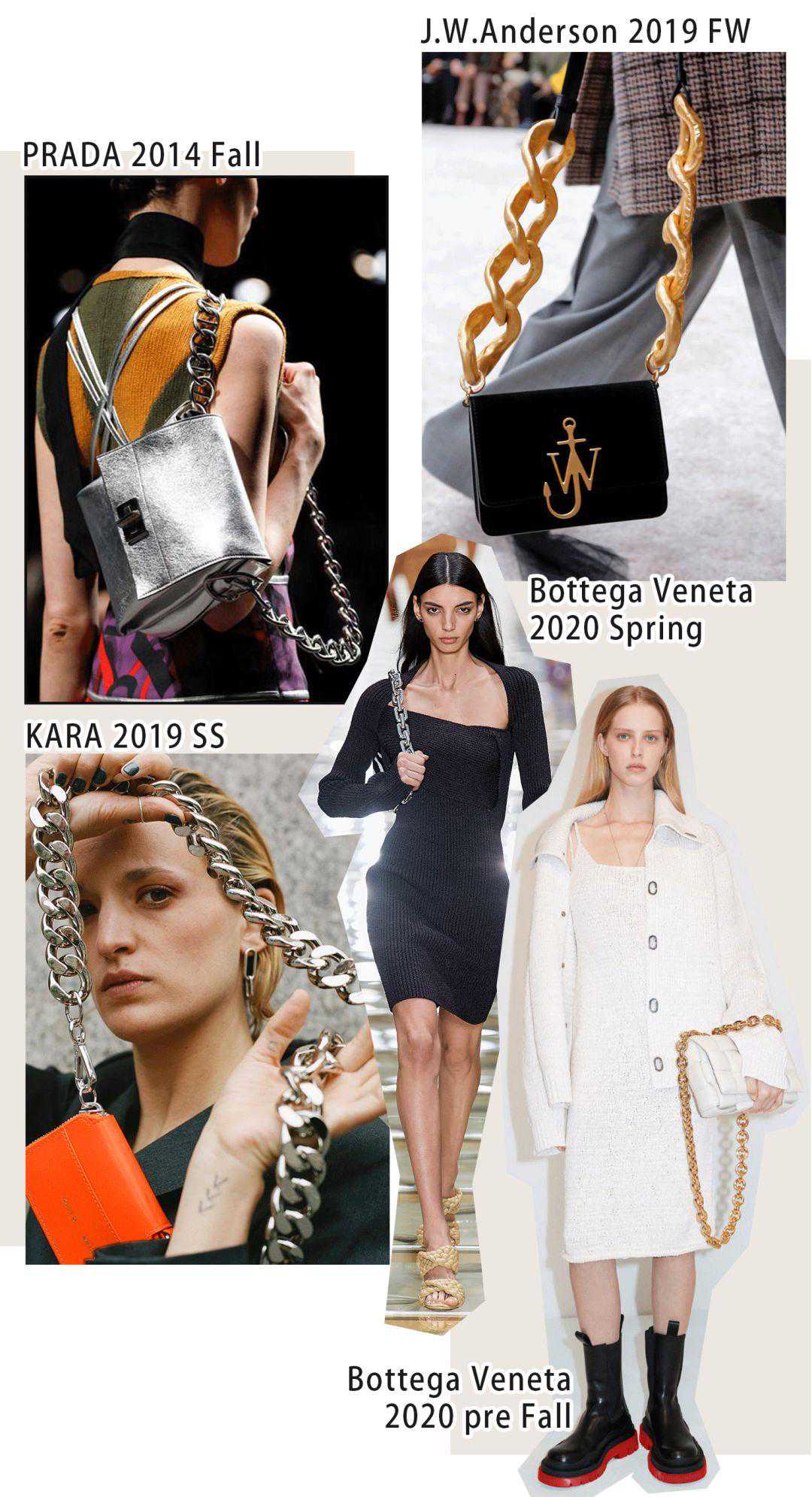 时尚圈对于粗链条的喜爱,这几年可以说是只增不减,PRADA、JW、BottegaVeneta、KARA等不少牌子都纷纷给自家包包安排上了大粗链子