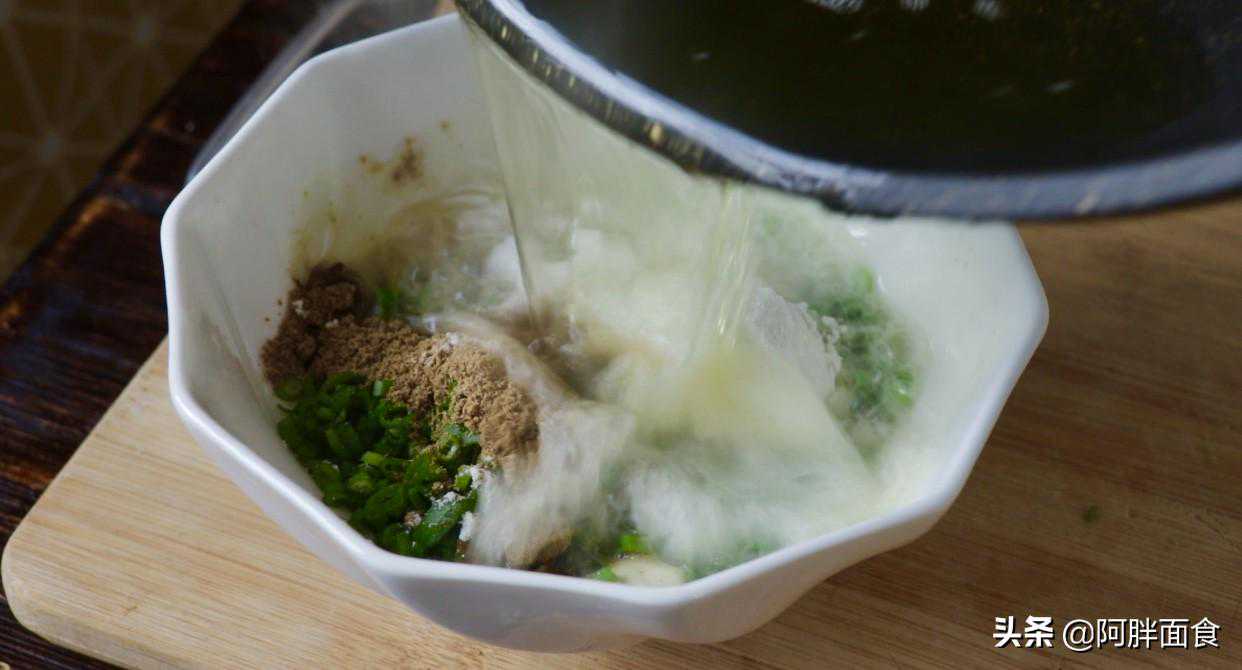 5,接下来做的是,手抓饼要用到的油酥。因为我喜欢葱香味的,所以用到了葱花,里面还有,十三香,面粉,食用盐,以及大豆油,把他们调成稀稀流动像牛奶的状态,就可以。至于调料放多少合适,这个就根据个人口味来了,喜欢什么就多加什么,但是盐要少放些,别做咸了,毕竟咱们吃手抓饼的时候,还是需要抹酱的哦。需要记住一点就是,豆油要提前烧热,然后泼上去。