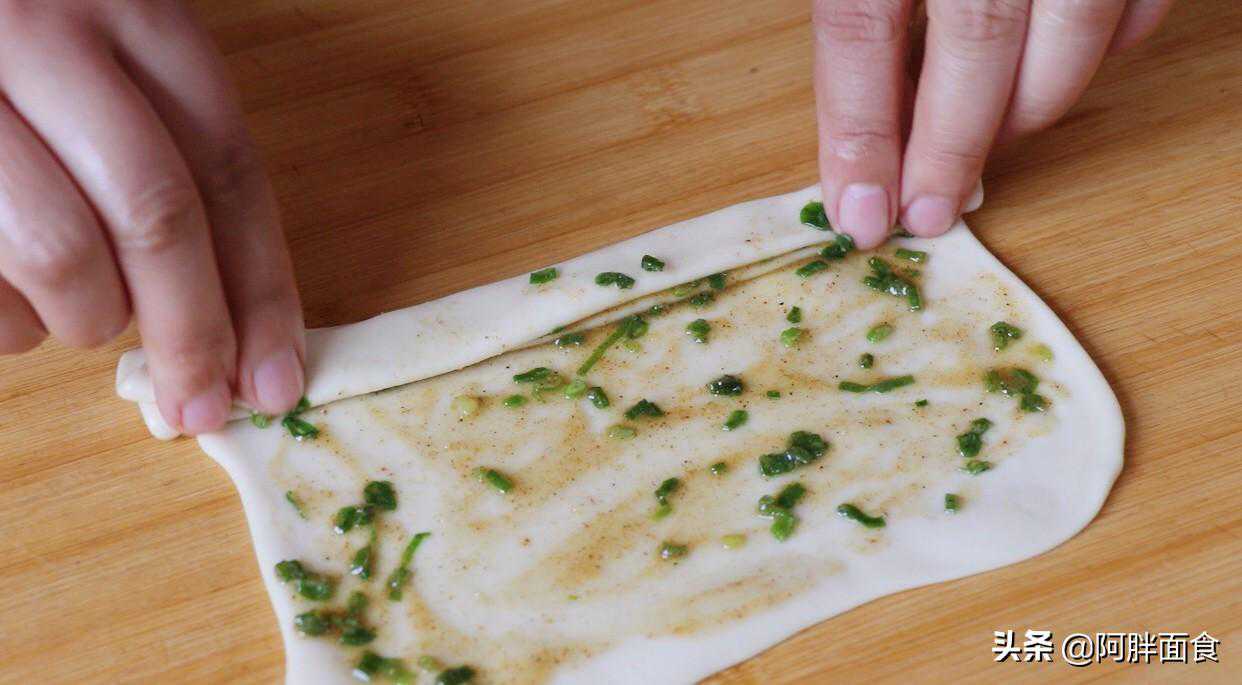 7,叠好后,抓起两头,在案板上,边摔打边拉长。最后再从一头卷起来,然后把尾部收在下面。再稍微按压一下,到这里,手抓饼也完成了很大一部分。
