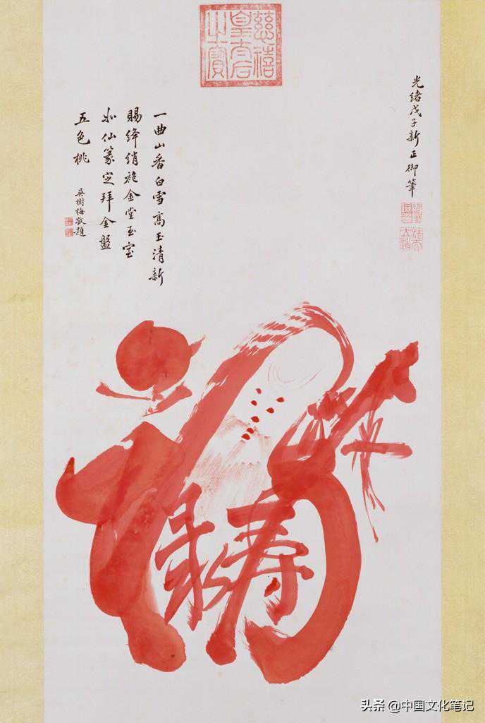 就我以为,那些盖有慈禧大印的书画作品,大部分是按照“慈禧指示、缪素筠创作”的方法绘制出来的。晚清的夏仁虎曾说,“内廷如意馆画工皆是苏州人,光绪间昆明缪素筠女史嘉惠工花卉,承旨二十余年。每当拈毫染翰,孝钦皇后并坐指示之,眷遇始终不衰。”所以慈禧太后只是“并坐指示之”,待画好之后,钤上自己的印章即可。