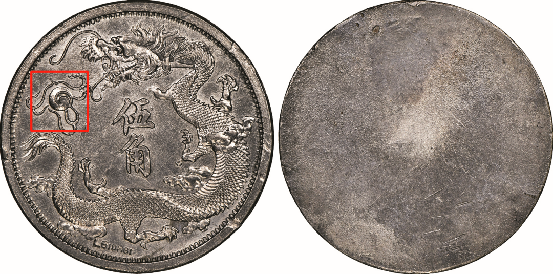 该币龙头类似第一次行龙样龙头设计,龙身类似第三次行龙样龙身设计。此版长须龙从打制的标准程度来看必属钢模初制,整体边缘周正且平整。马齿犀利,打制规整。整体压力足,边花及龙鳞无弱打,当属早期版。此版为阳叶版。