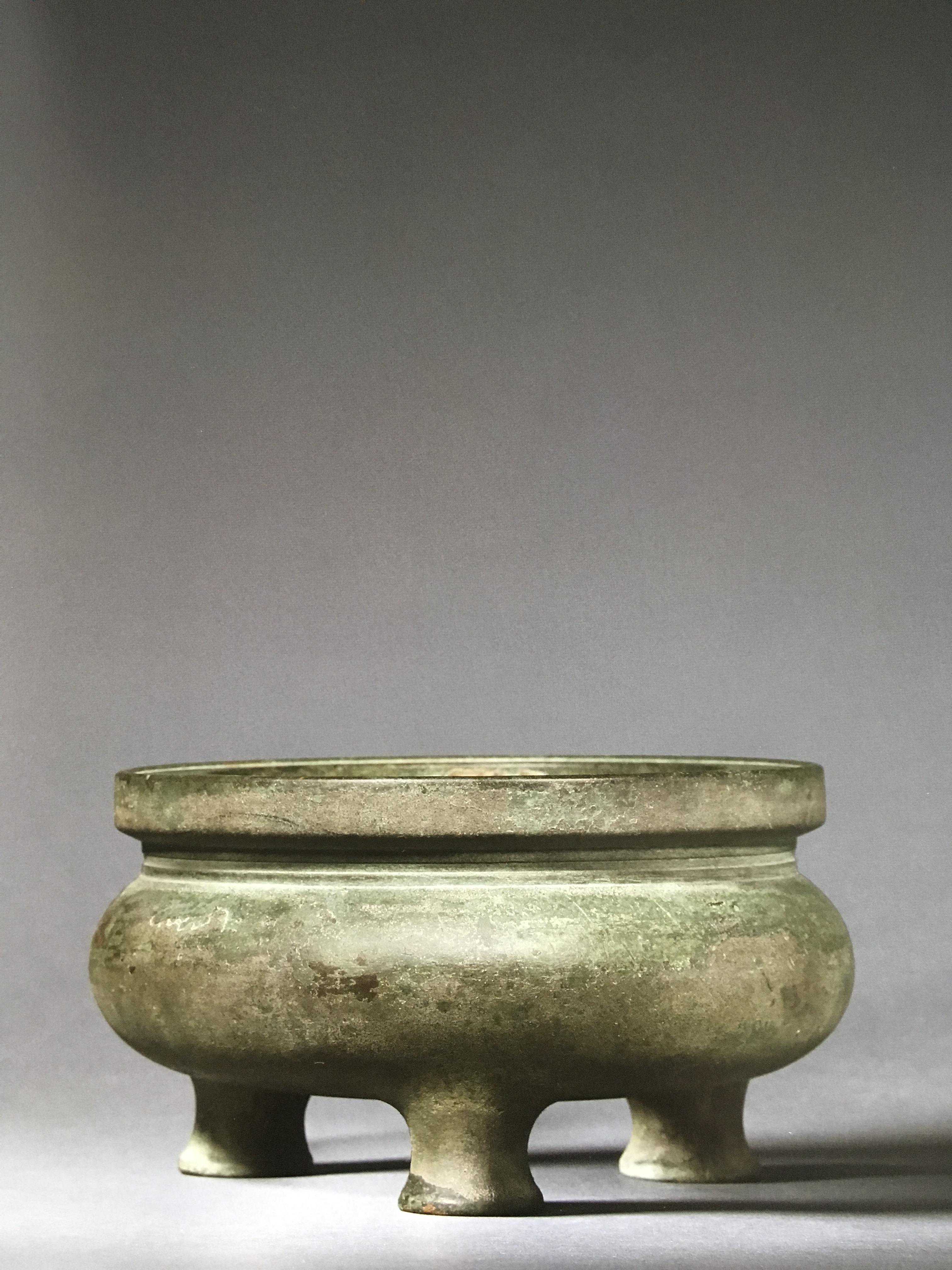 《宣炉小志》中曾经提到:塑身、无颈,斜下出垂鼓腹,缓收出底,承三乳足,高而外撇。炉身两侧塑连环圆耳,上肥下瘦,弯曲势收,穿以圆环,更显灵动可爱,这本书中也称其为琴炉,不知是否在古代文人雅士抚琴的时候身边也使用此类铜炉,目前笔者并没有找到古代书画作品有类似的刻画,故仅以文字形式表达希望未来能有更深入的了解与大家分享。