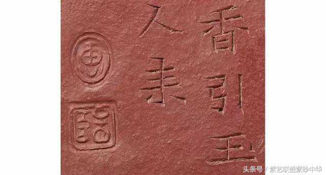 此梨皮朱泥形制亦如高梨,以粗砂为胎,与清初龙旦、文旦壶用泥相近,壶壁亦较厚实,口盖较宽,应为思亭壶式之前身,但气势更为雄浑。壶底铁刀精刻“香引玉人来”,反映工夫茶俗以茶代酒、以茶会友的心态。末署一圆一方“惠”、“孟臣”篆字阳文小章。