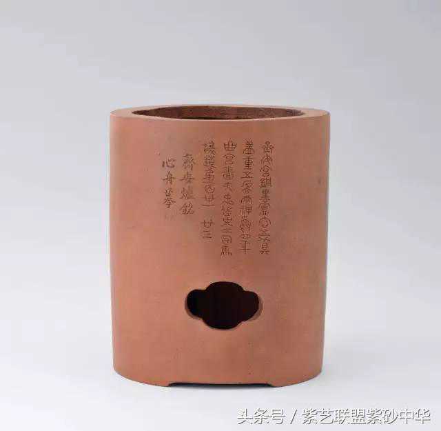 典型玉成窑泥胎,直筒形制,中腹微鼓,底承犴门,胎壁厚实。炉口呈梅花式,中下腹开孔海棠式,孔上壁沿铭刻“齐,安宫铜熏鑪,容五升具,盖重五斤六两,神爵四年典,宫啬夫忠佐史工司马让造,第一百三十一廿三。”,署款“齐安炉铭,心舟摹”,钤有“心舟”方印。此炉具设计简洁大方,大小适中,虽形制适宜日常茶事活动使用,却透出非一般的文人器气息。