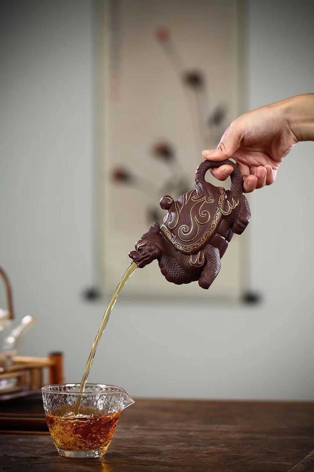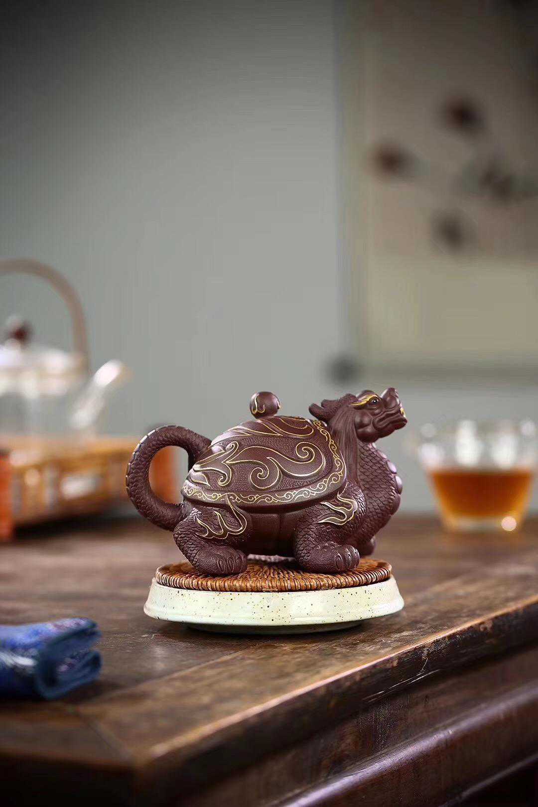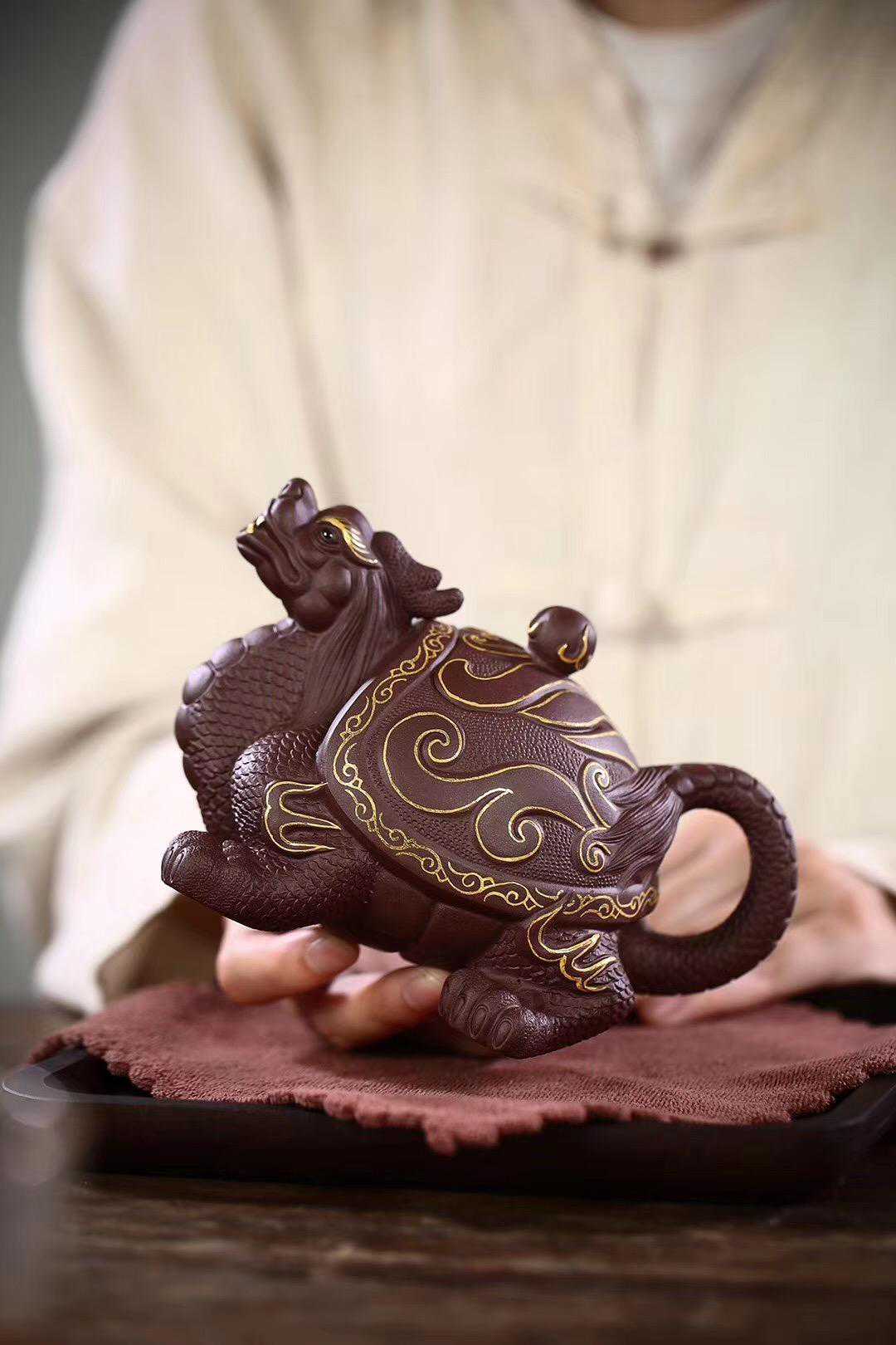 此款为全手工紫砂壶作品《如意龟龙壶》,壶身24K描金装饰,280毫升左右,精选优质紫泥,细腻柔和,色泽厚重,底蕴深厚,壶身圆润饱满,规整大气。创作造型逼真雄壮,壶身龟龙头仰天长啸,制作工艺复杂,寓意福寿康泰,广纳正财福禄。