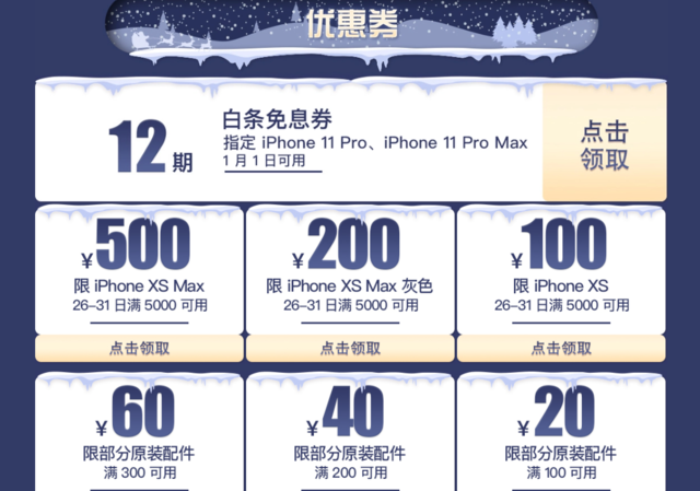 说到iPhone,本次年货节当然少不了iPhone的大幅优惠。31日前交纳500元定金,即可以惊喜优惠价在1月1日入手全新的iPhone11。针对iPhone11Pro,除了提供上述的以旧换新低价入手外,京东手机还准备了最高12期白条免息优惠。此外,iPhoneXS系列也有500元不等的满减券。