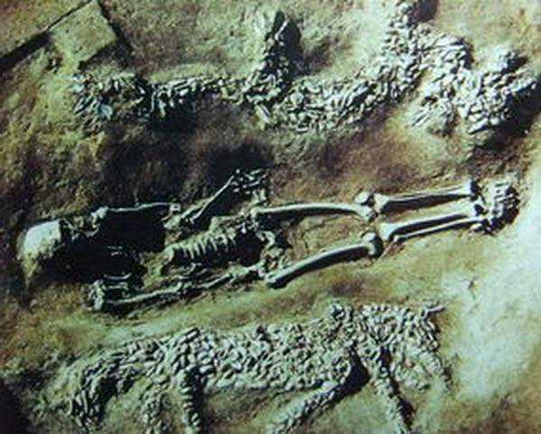 濮阳西水坡遗址出土的蚌塑龙。人骨上面的堆塑为龙,下面为虎。