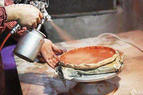 喷釉法:现代陶瓷施釉技法之一。用喷枪或喷雾器使釉浆雾化喷到坯体表面。适用于大型器皿及造型复杂或薄胎制品。可多次喷釉以进行多色施釉和达到较厚釉层。
