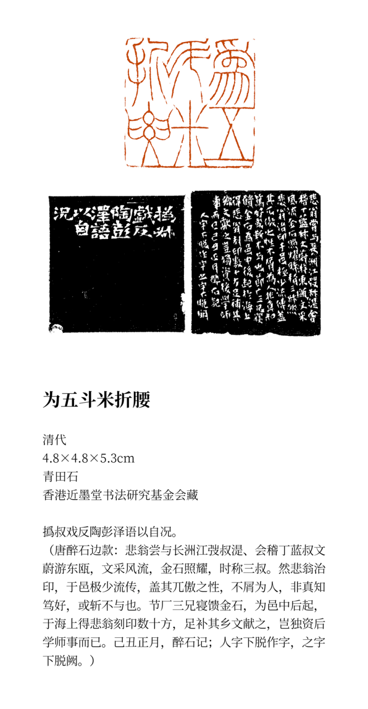 为五斗米折腰赵之谦清代4.3cm×4.3cm×6.1cm青田石香港近墨堂书法研究基金会藏