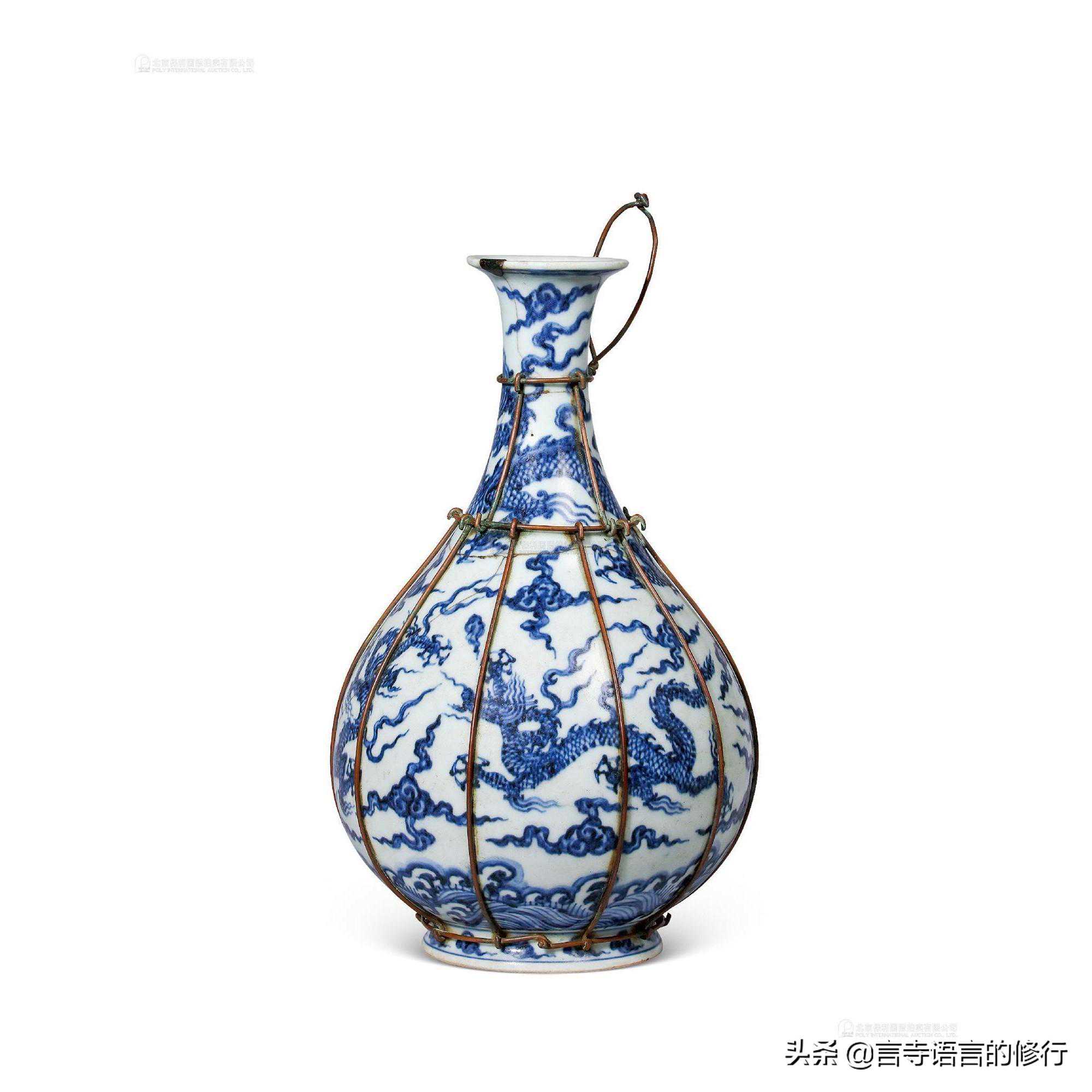 此瓶撇口,细颈,溜肩,鼓腹,圈足。通体青花装饰,满工绘出海水云龙图,气势磅礴,祥龙奋爪腾身,遒劲威武,一展叱咤风云之态。其画工精湛细腻,所绘五爪锋利,富具动感,鳞甲累累,质感逼真,龙首的双角、须发无不毫绿毕现,惟妙惟肖。笔触虽见工致却不落于孱弱,在浓淡相抹中独显永乐青花之豪迈气慨,深得水墨神髓。其胎釉温润莹洁,宝光内蕴,历数百年而风采依旧,与青翠披离之青花相得益彰,由此可折射出永乐窑器丰富深邃的美学内涵;遍查海内外公私收藏,此件青花海水云龙纹玉壶春瓶,极为罕见,永乐朝瓷器本身就存世极少,龙纹瓷器更是凤毛麟角,由此可知此件拍品之各项重要意义和价值。