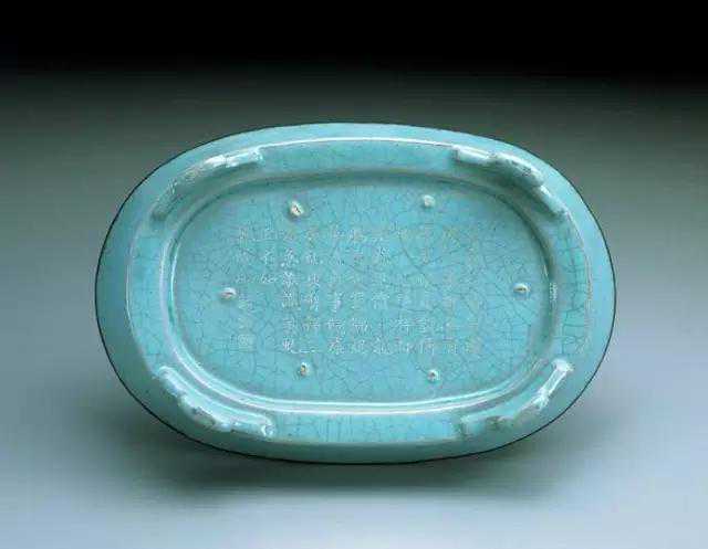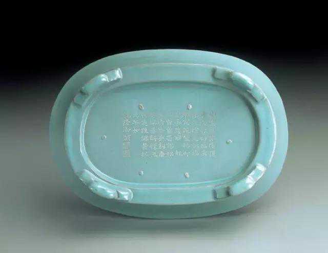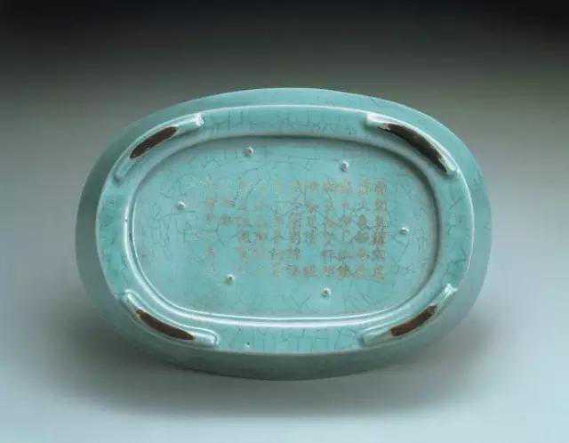 椭圆形盆、突出一圈侈口、深壁、平底、足底间突出一圈窄边稜、四足、足呈云头形。全器满釉不露胎,仅在器底留下六个细小支钉痕。器底刻有乾隆御题一首。明代鉴赏家曹昭在《格古要论》中提到,汝窑瓷器「有蟹爪纹者真,无纹者尤好」。这件水仙盆釉色匀润,通体无文,是传世所见唯一一件没有开片的汝窑瓷器。
