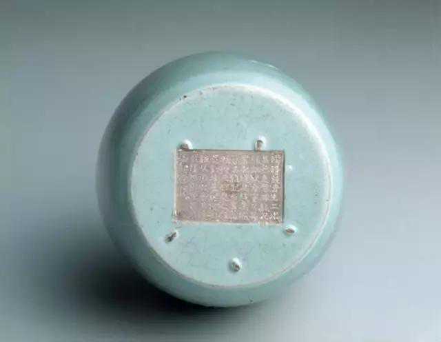 圆口、口沿磨平,长颈、折肩、直腹、平底,底部有五点支钉痕,并刻有乾隆丙申年(1776)御题。由题诗中“缘铜试看守口器”一句,配合器物口沿处痕迹来看,可以推测这件纸槌瓶和“奉华”款纸槌瓶一样,原本应也镶有铜扣,而且这些铜扣应该是早在乾隆御题前就镶上了。