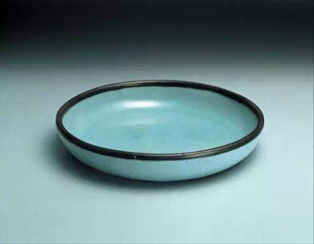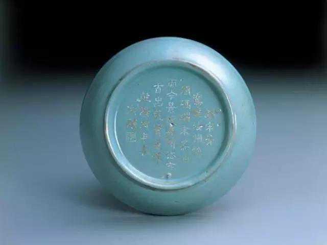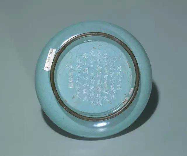 侈圆口、浅壁、平底、圈足外撇。底部有三细小支钉痕,口沿并镶铜扣。这件汝窑青瓷碟,底心刻篆书「丙」字,「丙」字周围并刻有乾隆甲午年(1774)春御题一首。
