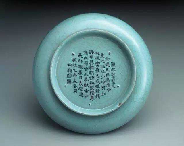 敛圆口、浅壁、平底、圈足外卷。器底有三个细小支钉痕,并刻有乾隆丙申(1776)春御题一首。诗文内容与现藏于伦敦大学大卫德基金会的另一件汝窑盘相同。这件藏于大卫德基金会的汝窑青瓷盘尺寸稍大,底有五支钉痕,并刻有乾隆已亥(1779)夏御题。二者诗文内容完全一致,但台北故宫汝窑青瓷圆洗除了御制诗外,还钤有一「朗润」印,二者在诗文布局上略有不同。