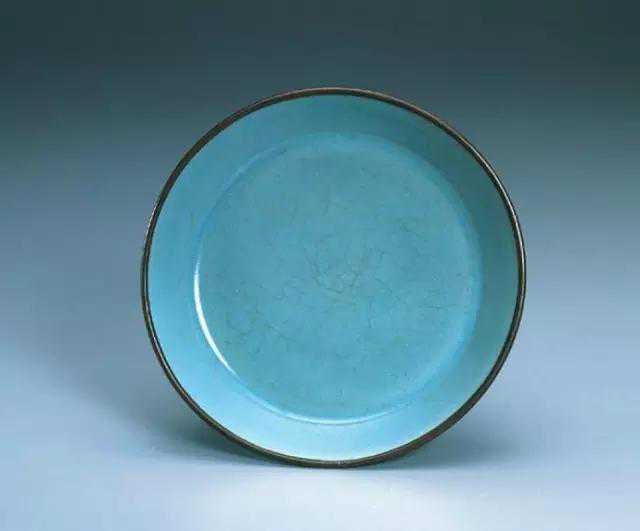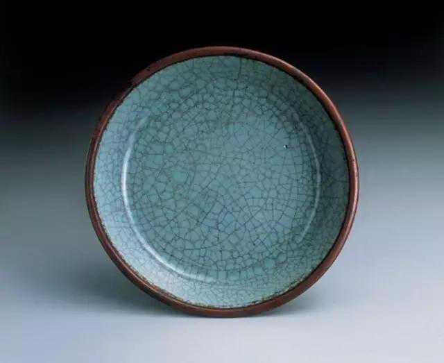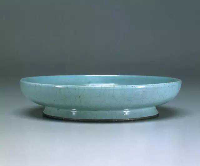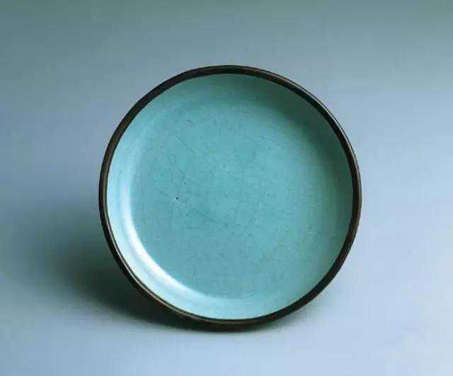 侈圆口、斜壁、平底、圈足外撇。底部有三细小支钉,口沿有镶嵌铜扣。这件汝窑青瓷碟、釉面满部细碎纹片,开片可能曾被污渍染色,纹路格外明显。