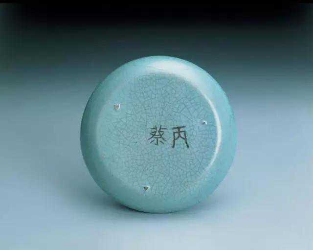 敛圆口、浅壁、壁微呈弧形、平底、无足,底部有三细小支钉痕。这件汝窑青瓷碟,底心郑重刻有“蔡”字,“蔡”字右侧又刻有一篆书“丙”字。二字虽都深入胎内,但刻制工艺明显不同。北京故宫藏有一件青瓷汝窑盘,该器尺寸稍大,器型撇口、弧壁、平底、圈足外撇、器底有五支钉痕,底心同样刻有一楷书“蔡”字。有学者推测这个“蔡”字是物主的姓氏,可能是徽宗时的权丞蔡京,或者是其子驸马蔡鞗的藏品印记。