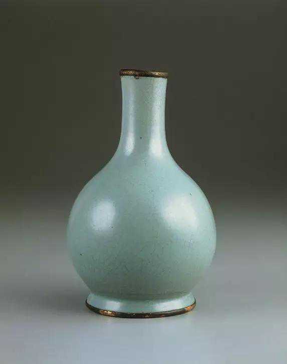 圆口、直颈,圆球型腹、平底、矮圈足、足向外撇。口沿及足沿皆镶有鎏金铜釦。底心去除一圈釉,并塗有褐色汁液,中心露出土黄胎色,可能是致垫痕迹造成。底部有釉底地方,则刻有乾隆乙末年(1775)御题一首。诗中提到这件胆瓶“通体纯清细纹”,观察本器可以看到布满细碎纹片,主纹呈现右下左上走向。河南宝丰清凉寺汝窑遗址曾出土一件天青釉撇口瓶,器型与本件相似但颈部较长,因此推测本件可能在清代时即因口部有伤而磨平并镶铜釦。