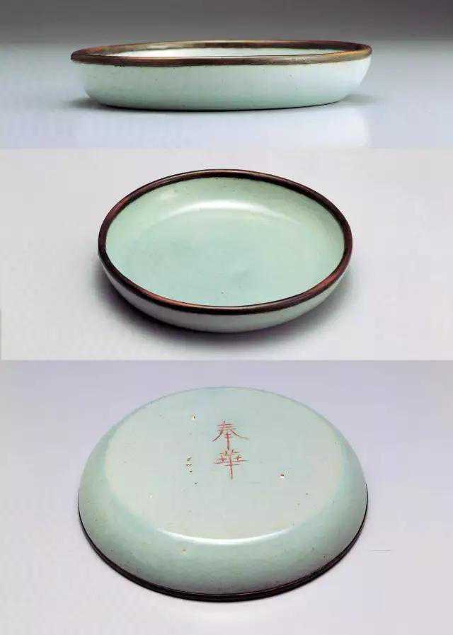 浅圆碟,口沿镶铜扣,底有三点细如芝麻的支烧痕,并有「奉华」二字刻于盘底中心。奉华二字刻痕细,内填硃红,由其痕迹观察应为支烧之后所刻。
