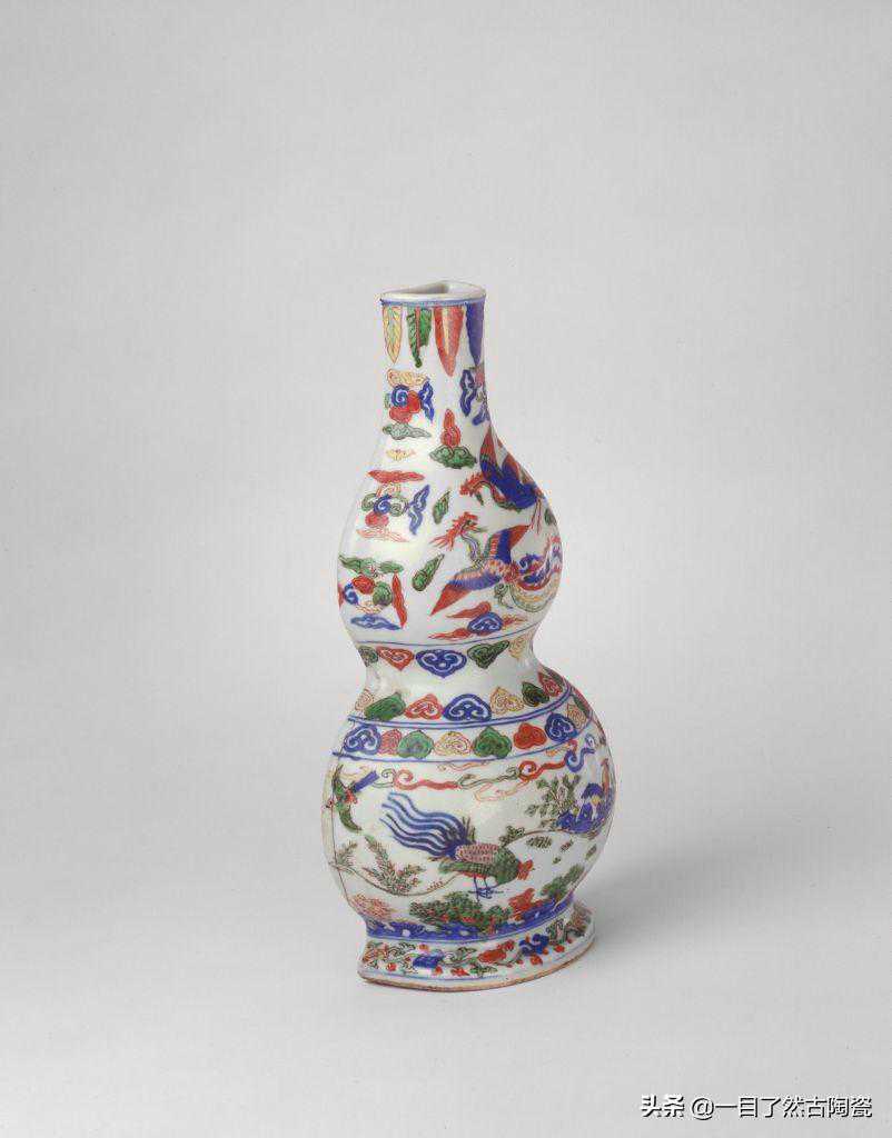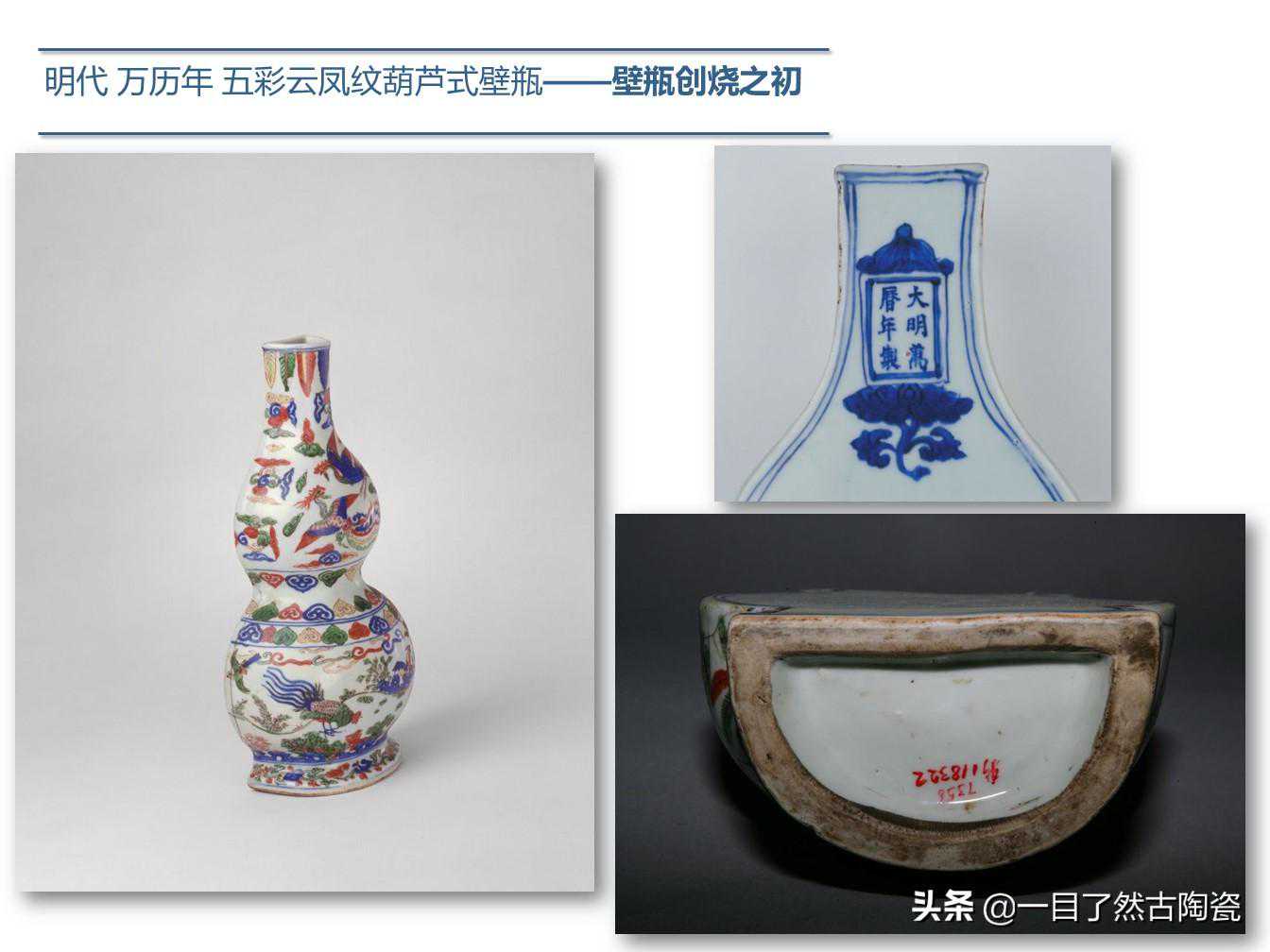根据耿宝昌先生《明清瓷器鉴定》一书记载,壁瓶造型最早出现在明代万历时期。万历十九年的《遵生八笺》一书记载有“四时插花,人作花伴,清芬满床,卧之神爽意快,冬夏两可”,表达了当时文人对壁瓶的喜爱。下图,明万历五彩云凤纹葫芦式壁瓶,经典的万历风格