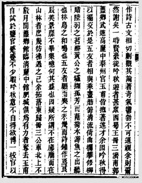 “相与乘画舫俯清流,倚曲欄攀修柳,赌陆羽之茗,醉黄公之垆,撷孤芳而荫乔木,游鱼之出听也,林鸟之和鸣也。五友者,顾而乐之,未几而诗钟作焉。良辰美景,无不毕集。噫,何其盛也!因疑所谓不在廊庙而在山林者庶几仿佛遇之。”