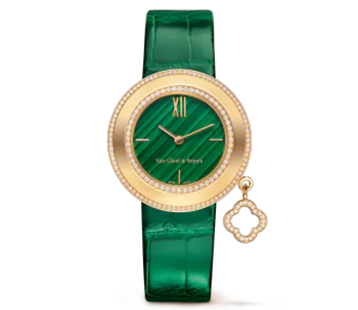 孔雀石原石的花纹大多为不规则的同心圆状,然而随随便便的花纹可是入不了顶级珠宝大牌法眼的!仔细观察VanCleefArpels梵克雅宝的孔雀石,你会发现每一块被选中的孔雀石都拥有笔直而清晰的纹路。